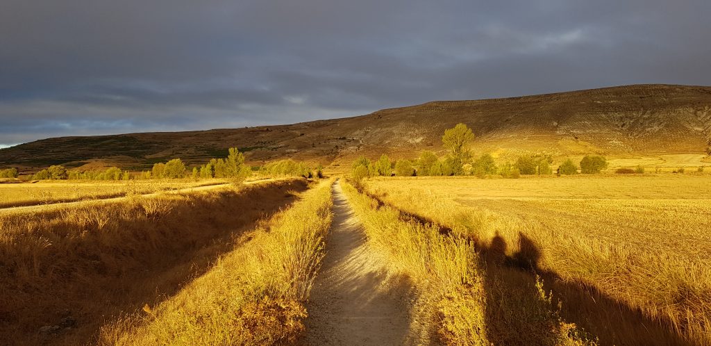Drumul ne scoate destul de repede de pe străzile pavate cu piatră și ne poartă din nou prin sălbăticia Mesetei. Soarele se înalță ușor iar lumina ce ne arată acum poteca îmi este cunoscută.