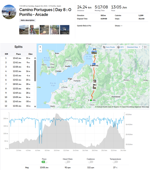 - Arcade este un orășel mic pe malul estuarului Vigo, ce merită vizitat. Nu pare prima alegere a pelerinilor care fie rămân în Redondela, fie merg mai departe. Sunt câteva opțiuni de cazare, atât albergue cât și hoteluri. Noi am ales de data asta un albergue privat, Albergue Casa Calvar, ce se poate rezerva în avans. Prețul este de 15 euro/persoană. Au și restaurant și o piscină unde te poți relaxa după o zi lungă pe poteci. Se găsesc locuri faine de luat masa și în oraș.