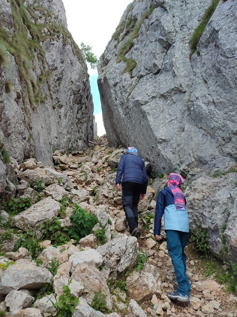 Ai mei zic să urcăm puțin. Nu mai am neapărat chef dar sunt totuși curioasă ce se află dincolo de culme. Ne croim drum printre doi pereți mari de piatră ce formează ca un tunel prin munte.