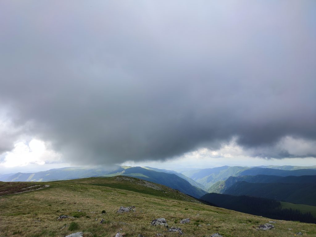 Urcăm șerpuit ca să nu ne obosim picioarele, și înaintam destul de repede. Dar ce să vezi, norii de ploaie se adună din ce în ce mai mult iar de îndată ce ajungem în culme ne dăm seama că ploaia e cam aproape de noi.