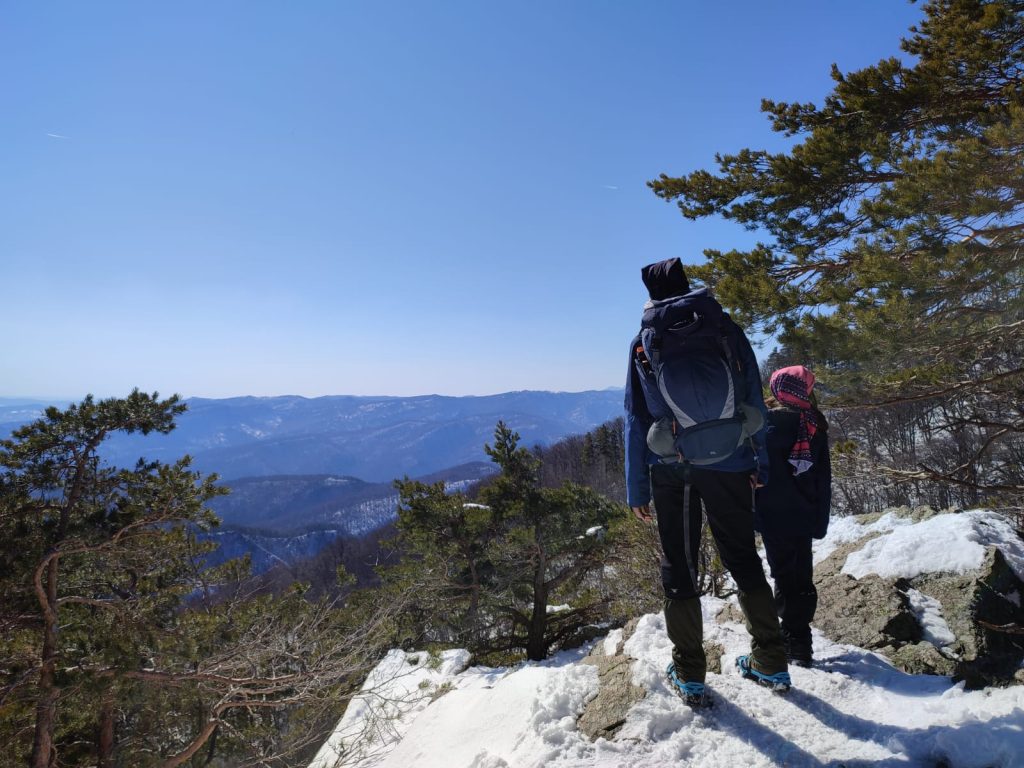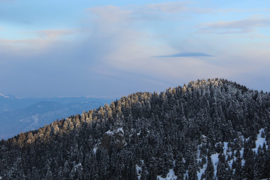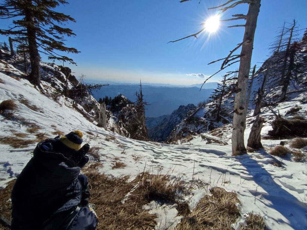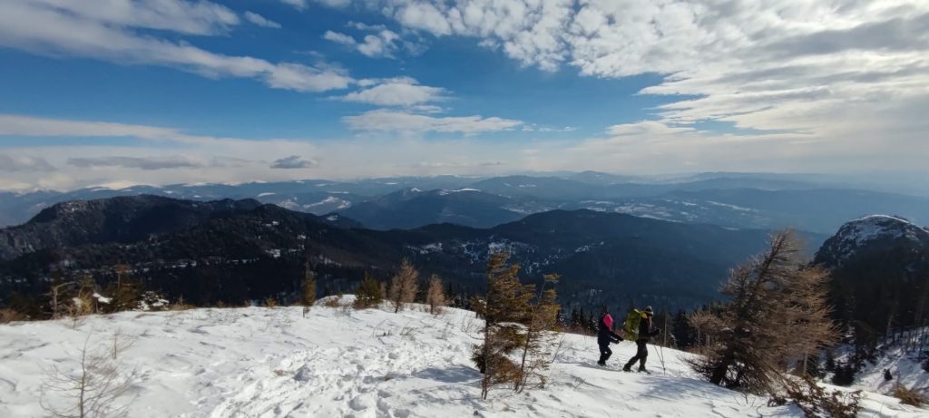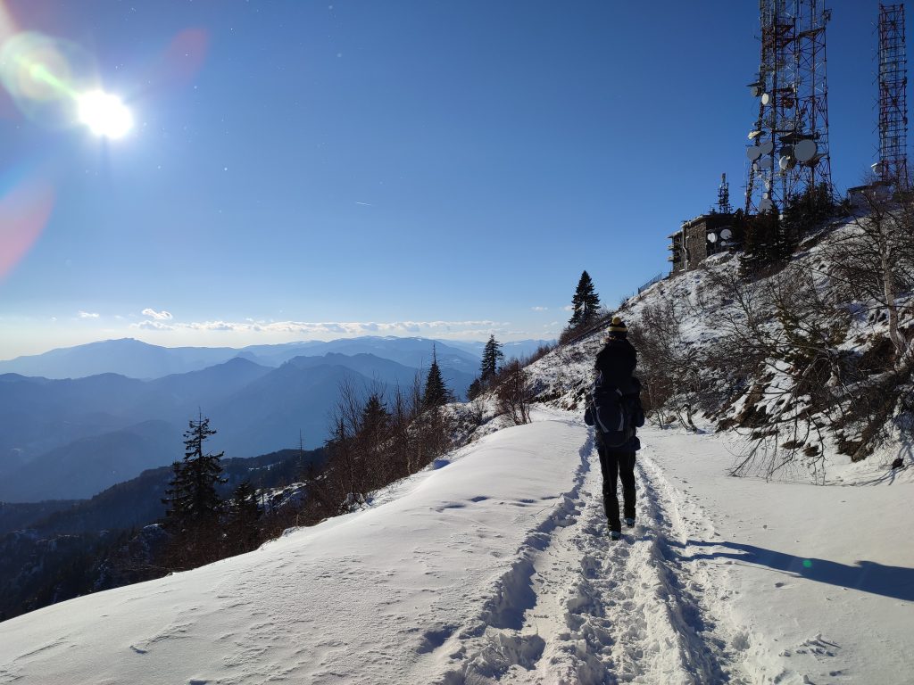 Astăzi în schimb este o zi frumoasă și la început de traseu pare că nu e cine știe ce iarnă. Văd de jos vârful pe care trebuie să ajungem. Hai că nu pare așa de mult..
