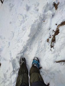 Ne punem gheruțele ca să putem urca mai bine, dar mie mi se pare și mai greu, chiar dacă nu mai alunec.