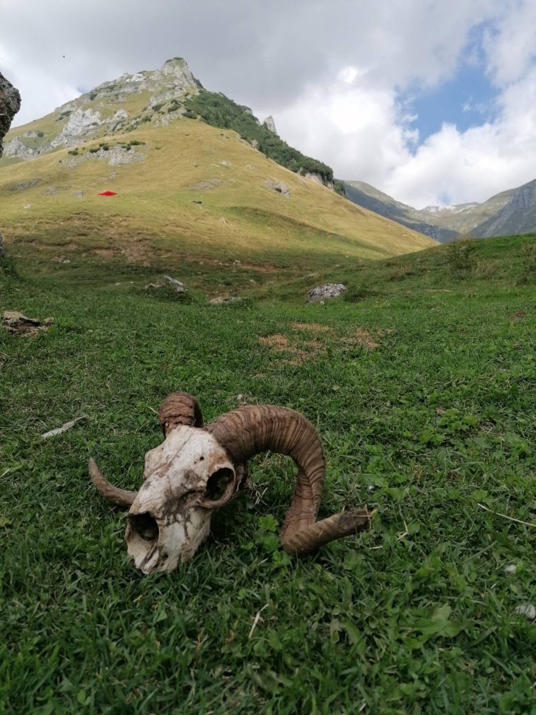 Peisajul pare desprins de pe o insulă pustie: trecem un pârâu peste un pod de lemn, roci cu licheni colorați sunt împrăștiați prin iarbă, capul ăla de berbec zici că a căzut de pe o navă de pirați. Wooooah, ce? Mă duc să-l studiez mai de aproape. Hmmm, oare ce caută aici? Ce dubios.