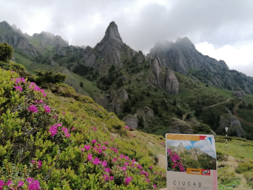 În orice direcție m-aș uita, bujorul de munte acoperă culmile. Iar în depărtare, muntele se vede chiar roz, așa cum mi-am imaginat. Ajungem în locul în care am fost vara trecută, care îmi place foarte mult. Dacă pe celălalt drum toate pietrele arată ca niște dinozauri, când ajungi în Șaua Tigăilor, pare că ai ajuns la poarta unui imens castel.