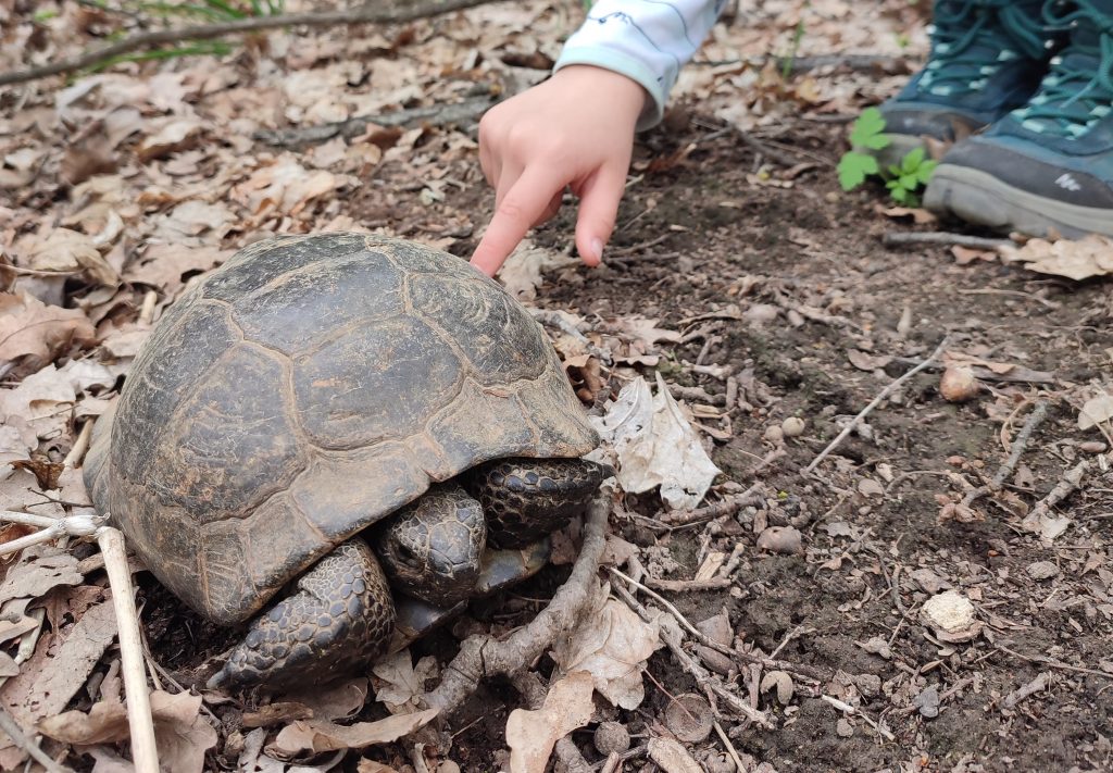 Face dreapta prin padure. Eu mă duc după ea. Nu știu cum a văzut-o de la distanță, căci are aceeași culoare cu frunzele uscate de pe jos, dar, în sfârșit, vedem o broască. Și una chiar mare. Săraca, se sperie de noi și se bagă în carapace. Eu încerc să o mângai ușor, ca să vadă că nu vrem să îi facem rău.