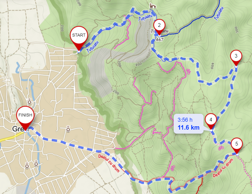 Marcajul începe din centrul localității Greci și merge în paralel cu un traseul de bicicletă. Marcajul se pierde la ceva timp după vârful Țuțuiatu și continuăm pe o porțiune nemarcată ghidându-ne după hartă.