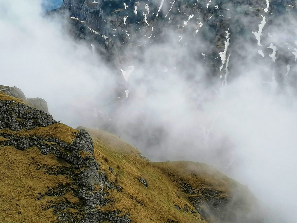 Soarele fuge iar pentru o vreme, la fel și traseul, poteca sau caprele. Totul este efemer sub vraja negurii ce a pus stăpânire astăzi pe Bucegi.